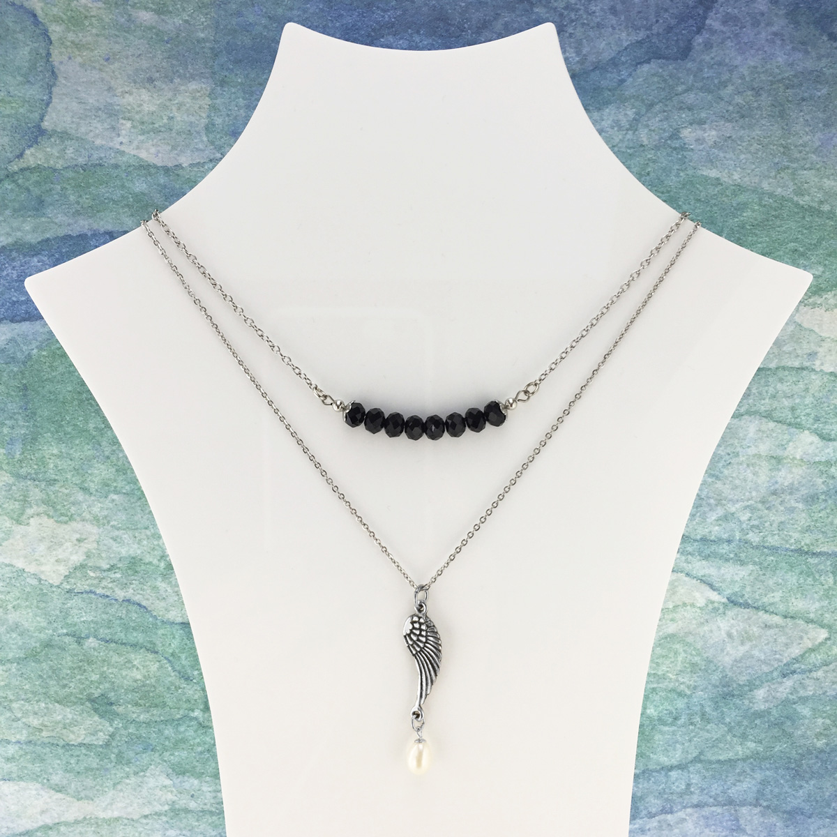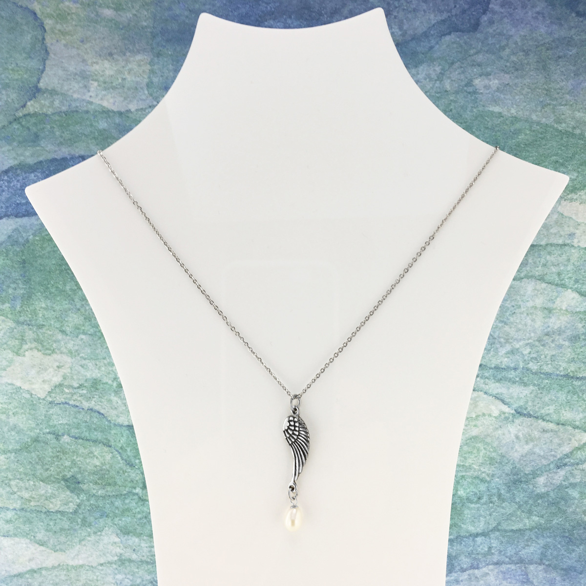 Stainless steel chain necklace featuring a superbly detailed pewter angel wing and freshwater pearl. Made in Australia with the finest lead-and-nickel-free pewter. Length is 45cm and extends up to 50cm.
