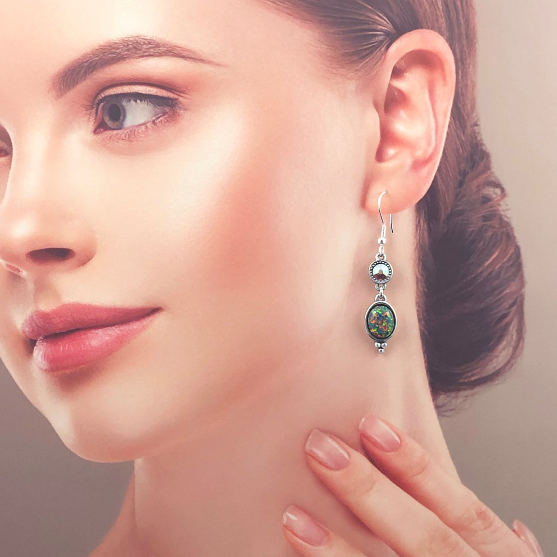 These Australian made vibrant black opal (created opal) earrings are intricately detailed in an elegant art nouveau style. They feature a sparkly Swarovski crystal above. These premium quality earrings feature stainless steel hooks as well as the finest lead-and-nickel-free pewter which is a naturally tarnish-resistant metal that has been used for centuries. Full length: 5 cm.