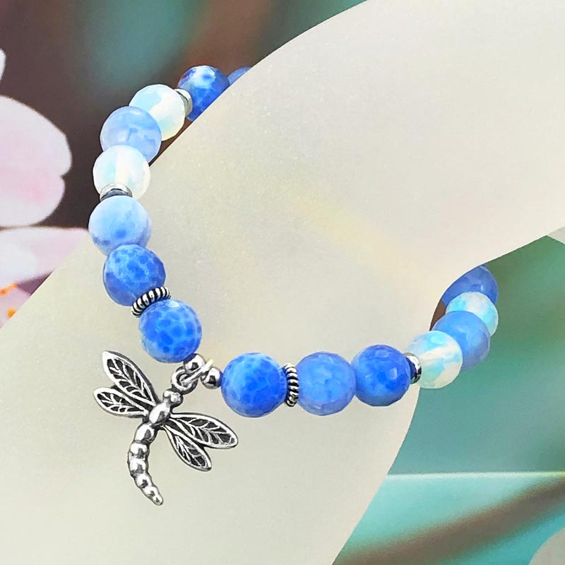 Select the charm of your choice on this genuine semi-precious blue fire agate gemstone bracelet. This strikingly pretty stretch bracelet is easy to wear and perfectly suitable for a layered look. All our unique charms are hand-sculpted by the artist in our studio. Charms are 100% genuine solid pewter. We use only the highest quality stretch cord. Bead size is 8 mm.