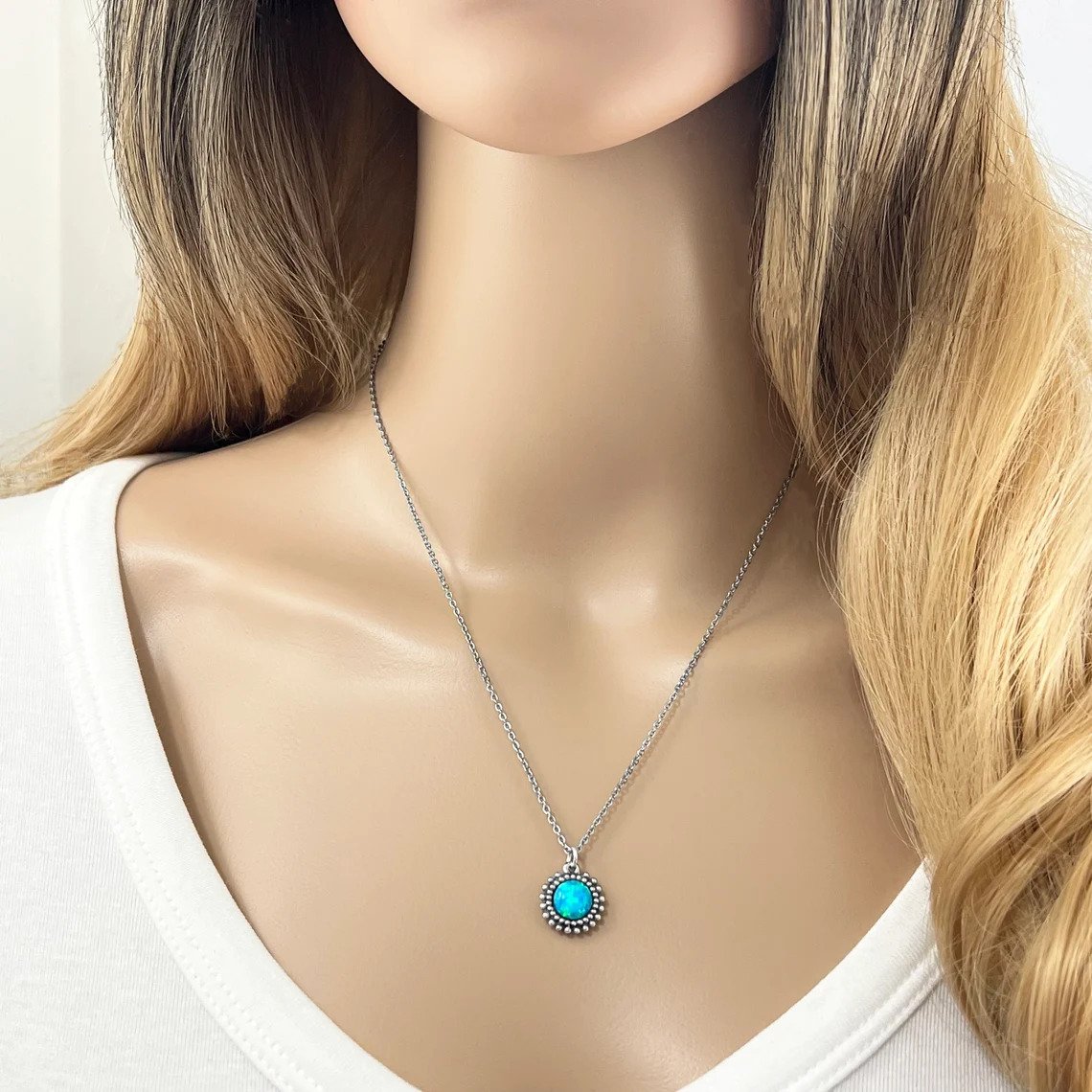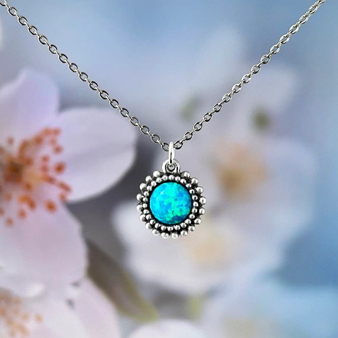 Blue Fire Opal necklace. Featuring a beautiful, shimmering vivid iridescent blue opal (created opal). Made in Australia with the finest lead-and-nickel-free pewter. High quality stainless steel chain is included. Length is 46cm and extends up to 50cm. Opal size 8mm, pendant size 1.2cm.