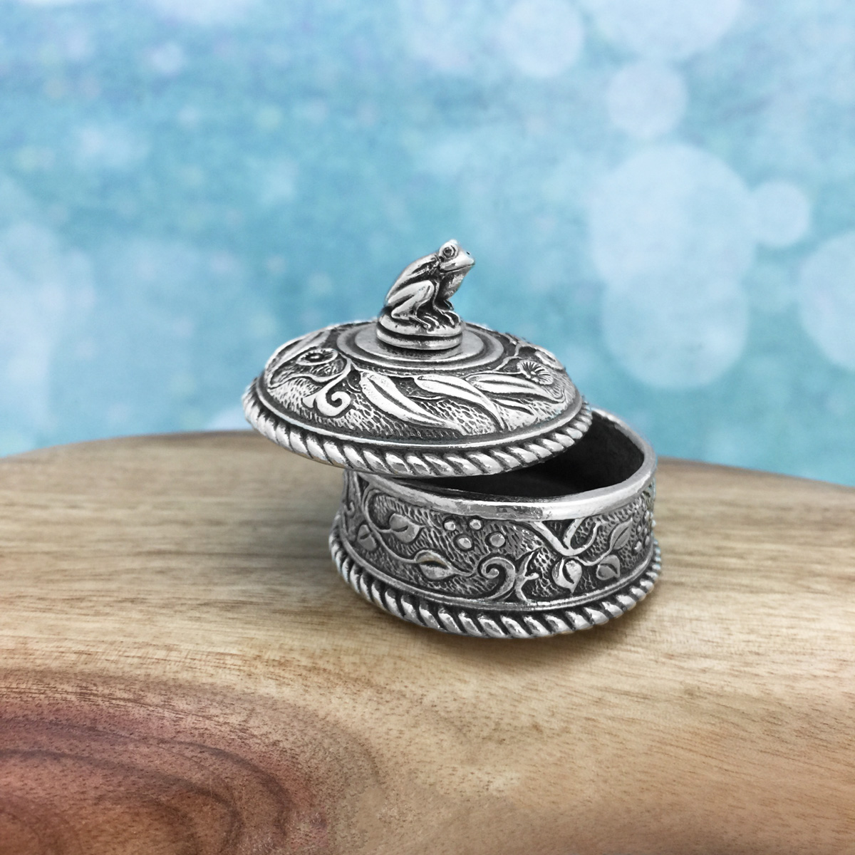 Intricately detailed miniature jewellery box featuring a frog. Made in Australia out of the finest lead-and-nickel-free pewter. Width: 4cm.