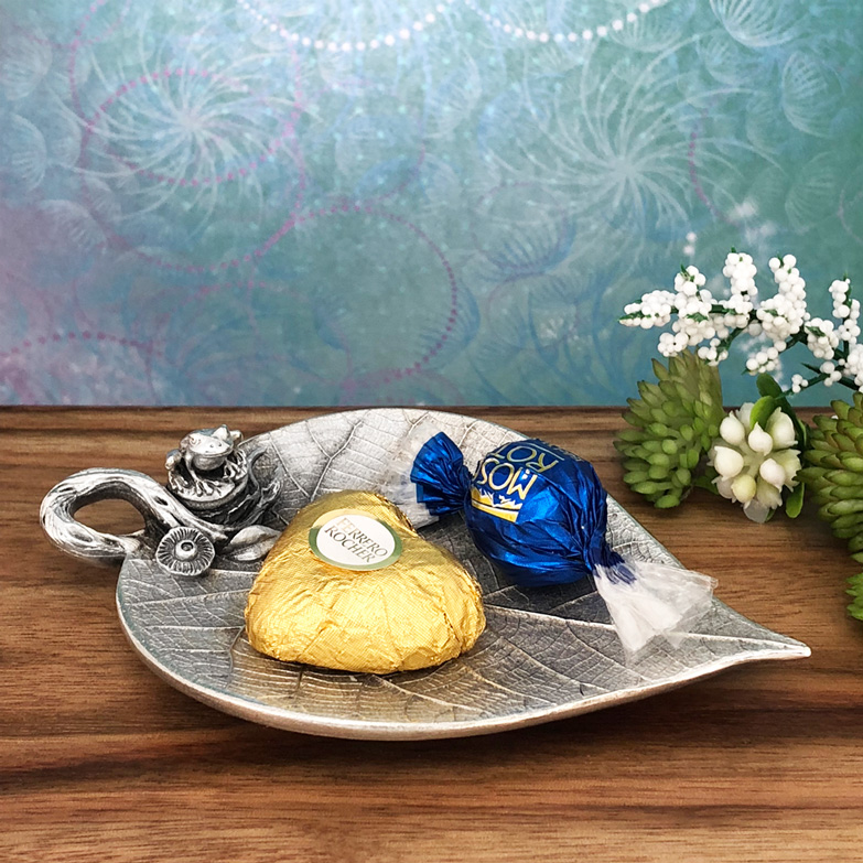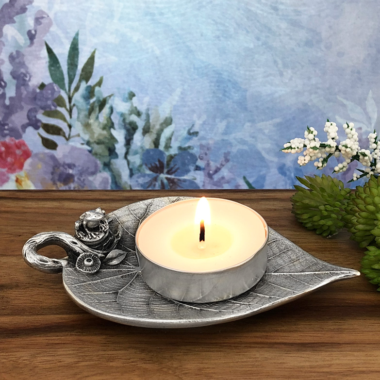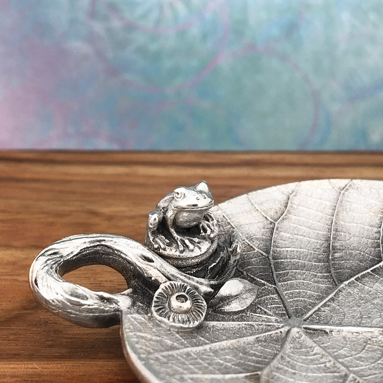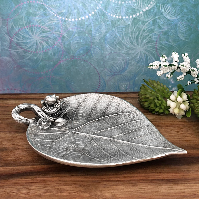 This enchanting, nature-inspired, leaf-shaped trinket dish is accompanied by a little Frog sitting at the edge of this sweet and heart warming nature scene. The leaf itself is highly detailed with intricate natural patterns even underneath the leaf. It’s a very versatile home decor gift perfectly suited to tea lights, wedding rings, jewellery, candy or even as a teabag holder. We trust that this beautiful piece will be a lasting treasure for years to come. Made in Australia out of the finest lead-and-nickel-free pewter. Width: 7cm, Length: 10 cm, Height: 3 cm.