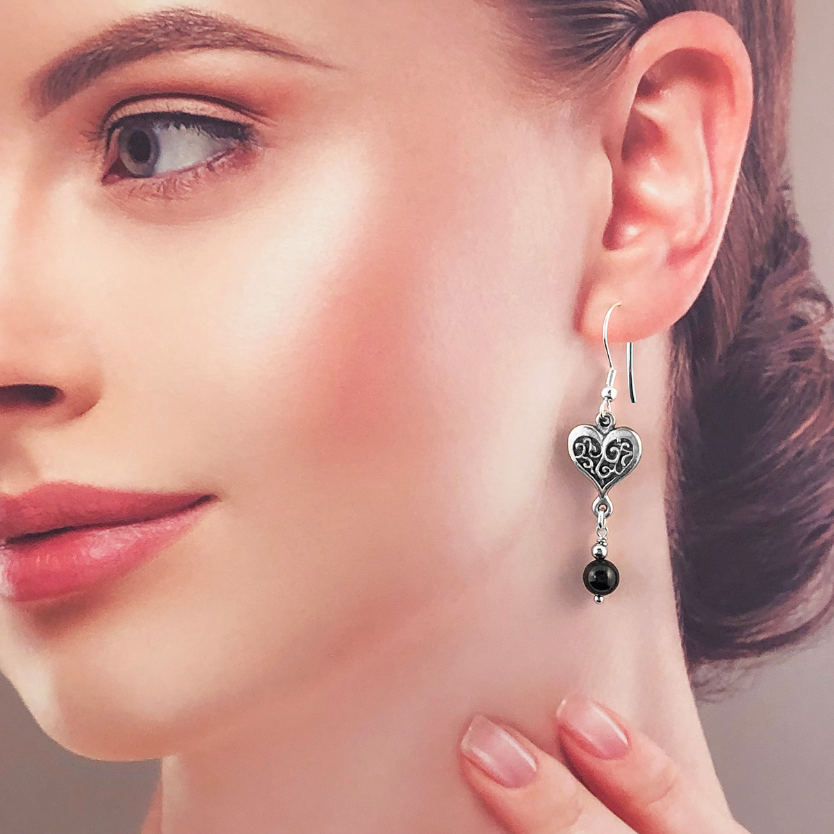 Heart earrings in a beautiful Victorian style, intricately detailed with genuine black tourmaline round drops. Made with quality stainless steel french ear wires in a sterling silver finish. Matches perfectly with this bracelet. 5cm long (from the top of the ear hook) and 1.5 cm wide.