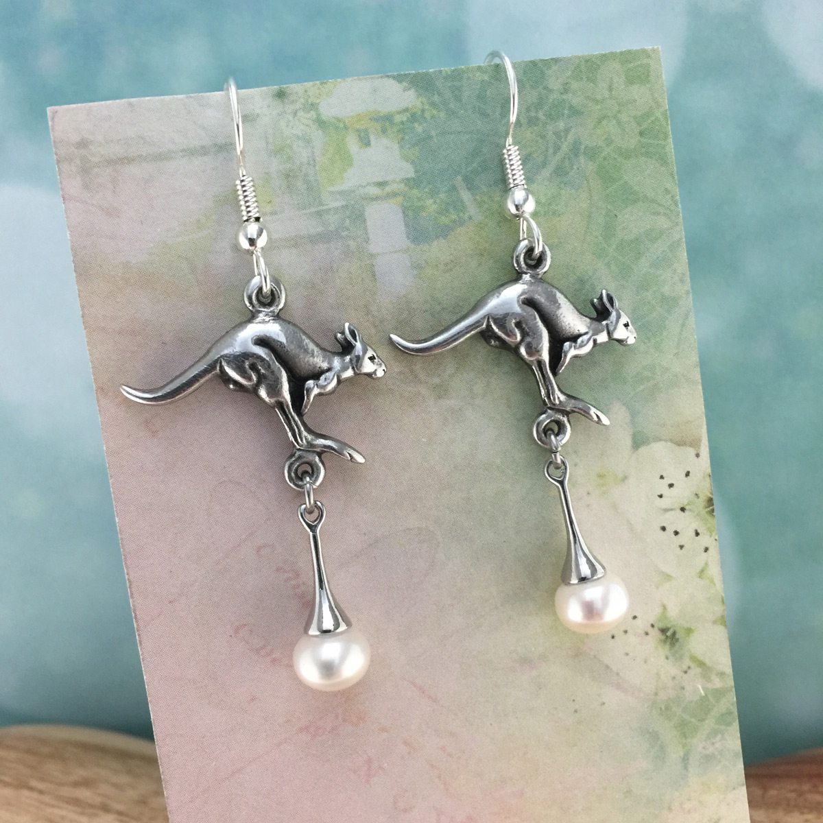 Australian made earrings featuring an intricately detailed native Australian kangaroo & Swarovski pearl. Length: 5.5cm.