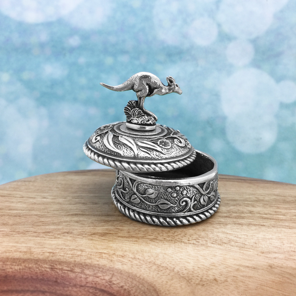 Intricately detailed miniature jewellery box featuring the native Australian kangaroo. Made in Australia out of the finest lead-and-nickel-free pewter. Width: 4cm.