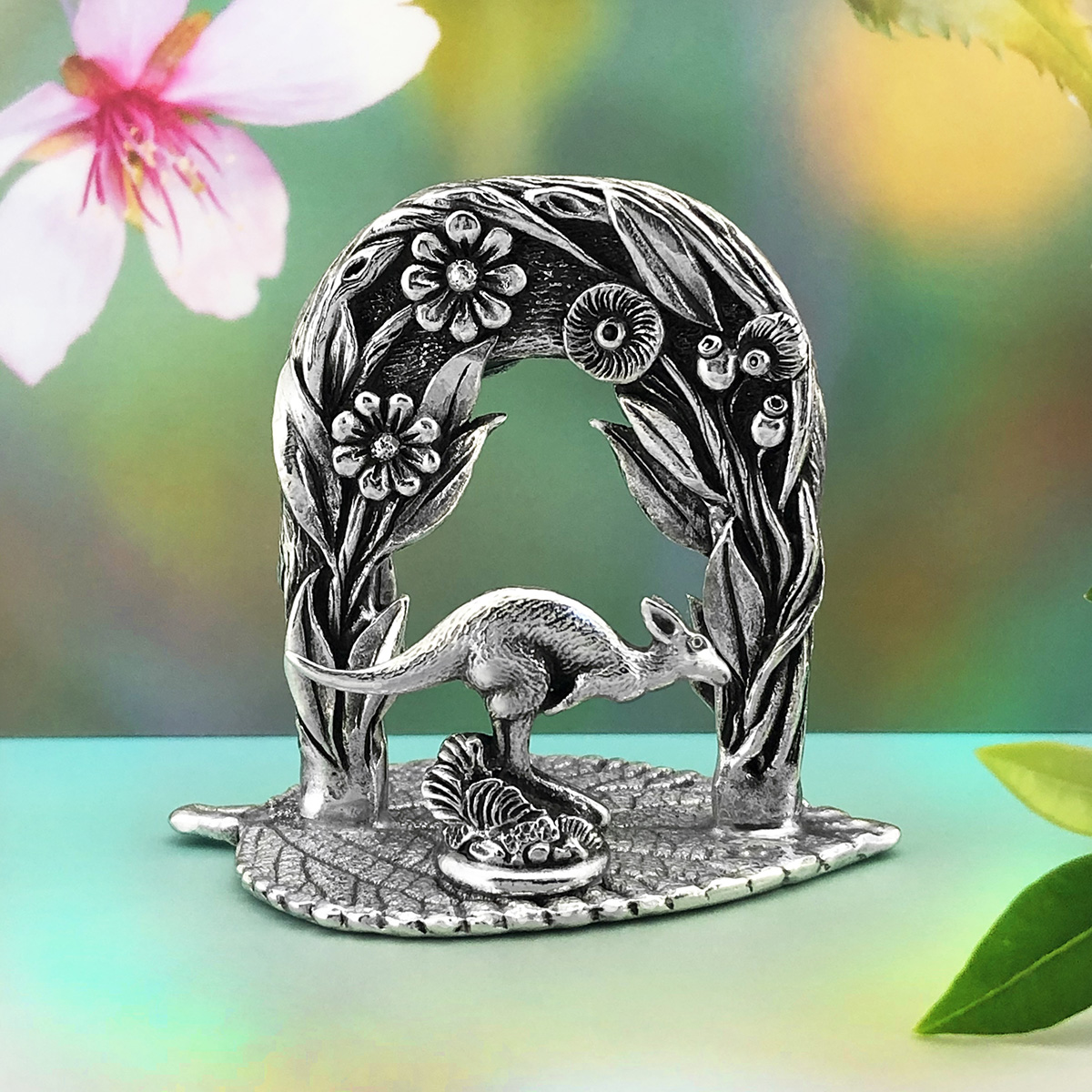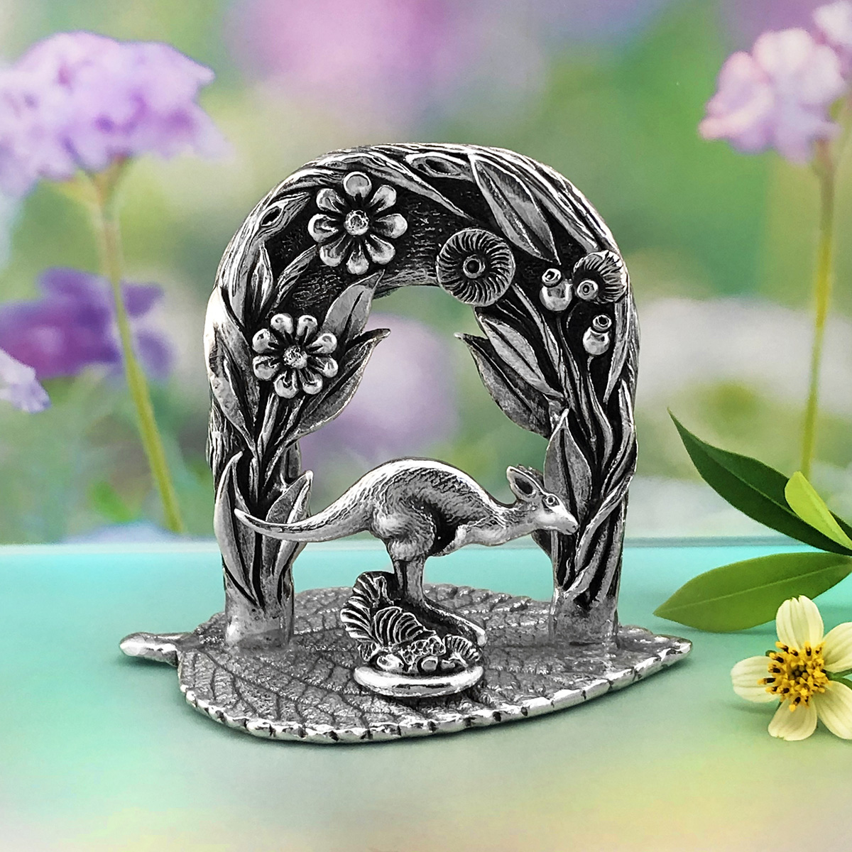 This Kangaroo “My Garden Friends” figurine is sweet and enchanting. It’s intricately detailed, featuring a very cute Kangaroo in a beautiful floral garden archway, depicting the unique flora and fauna of Australia. A perfect gift for a child or anyone young at heart. The design is 3-dimensional, sculpted in detail on the both sides. Made in Australia out of the finest lead-and-nickel-free pewter. Height: 4.2cm. Width: 5cm.