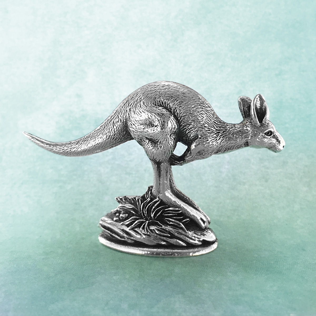 Intricately detailed Australian kangaroo figurine. Made in Australia out of the finest lead-and-nickel-free pewter. Length: 8cm.