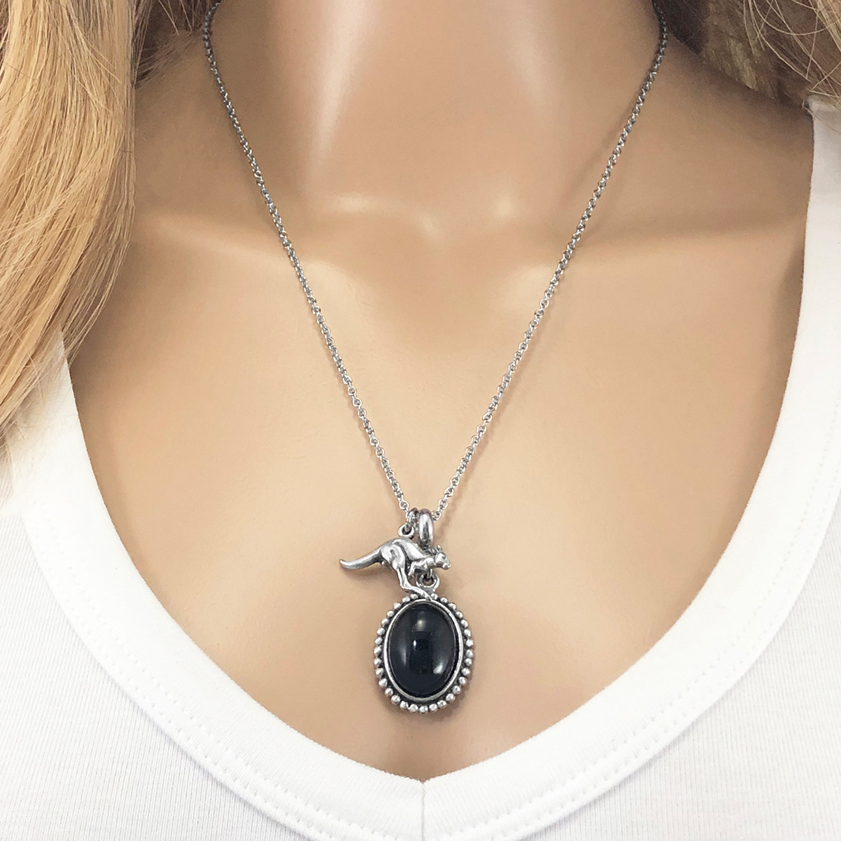Natural black onyx gemstone necklace featuring a superbly detailed pewter Kangaroo charm. Chain length is 50cm / 20inches. Let us know in the order notes field if you need a different length! Cabochon size: 13x18mm. Setting size 16x20mm. Kangaroo charm size: 24x16mm.