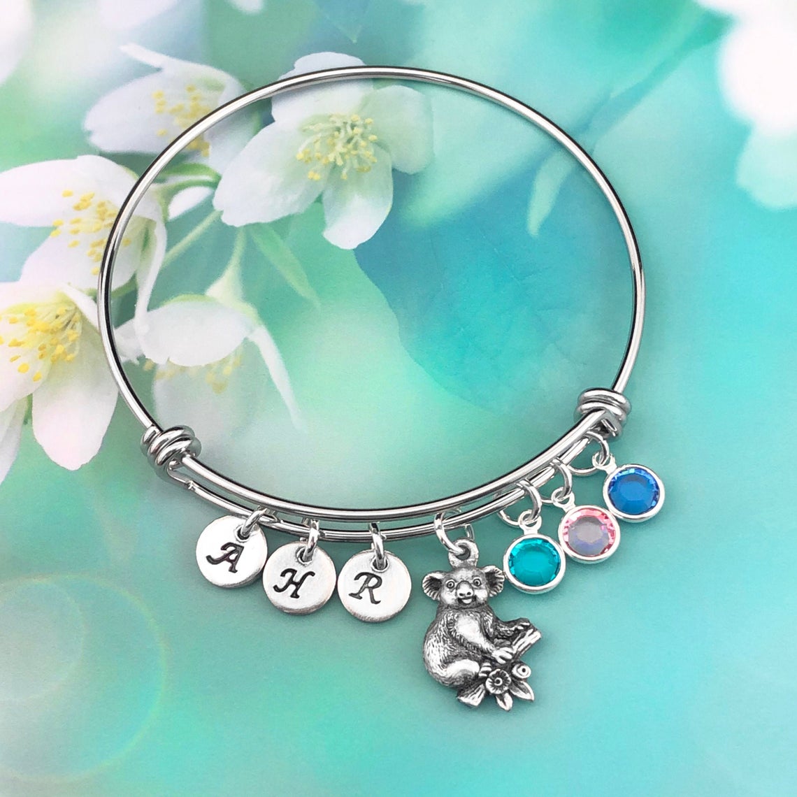 Koala Adjustable Bangle Bracelet with Personalised Initials & Birthstone Charms