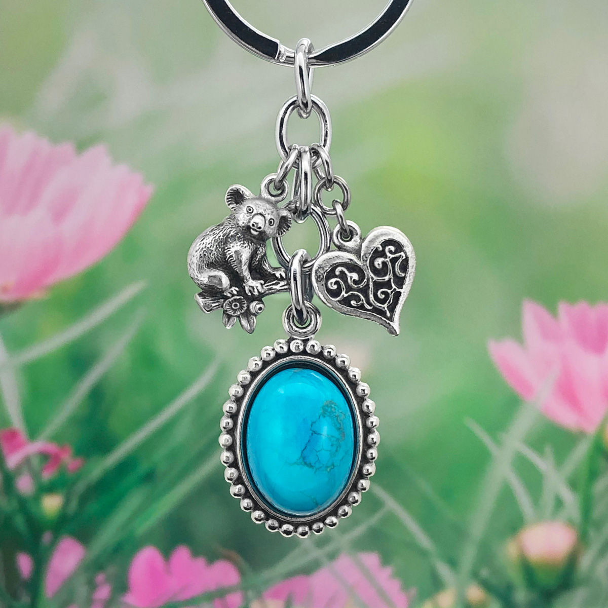 Superbly detailed koala & heart charms with large turquoise magnesite gemstone set in beautiful solid pewter setting. Made in Australia out of the finest lead-and-nickel-free pewter. Entire length: 8.5cm.