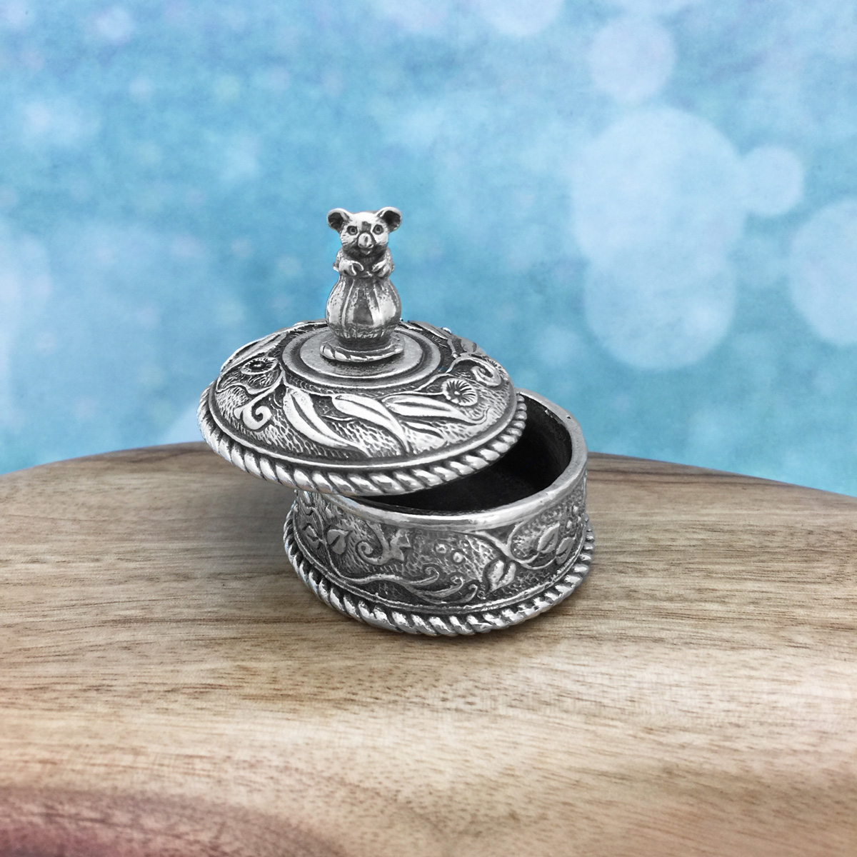 Intricately detailed miniature jewellery box featuring the native Australian koala. Made in Australia out of the finest lead-and-nickel-free pewter. Width: 4cm.