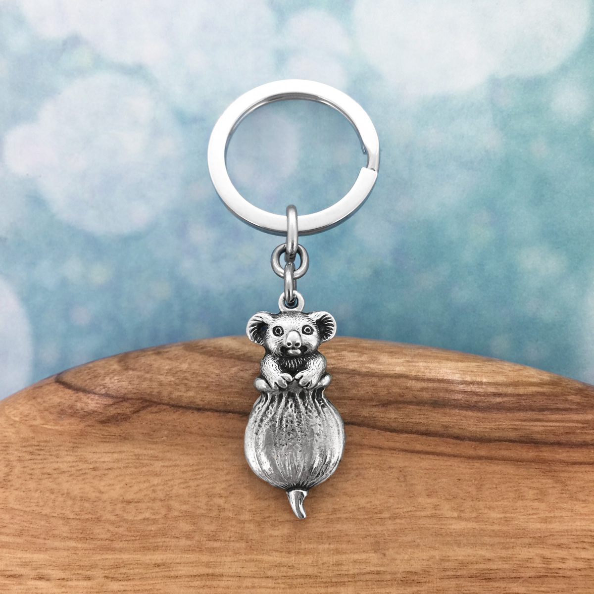 Intricately detailed keyring featuring the native Australian koala. Made in Australia out of the finest lead-and-nickel-free pewter. Entire length: 8.5cm.