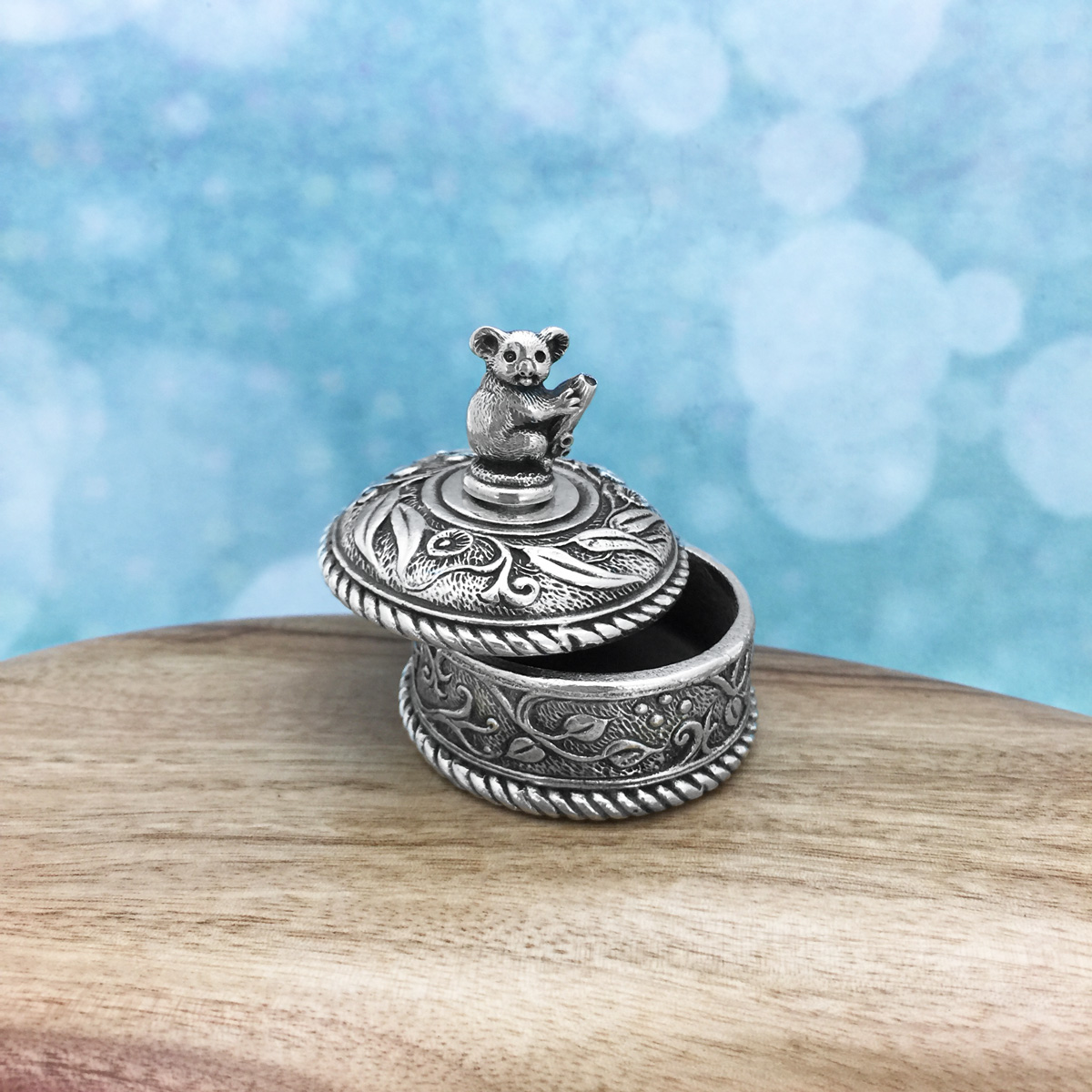 Intricately detailed miniature jewellery box featuring the native Australian koala. Made in Australia out of the finest lead-and-nickel-free pewter. Width: 4cm.