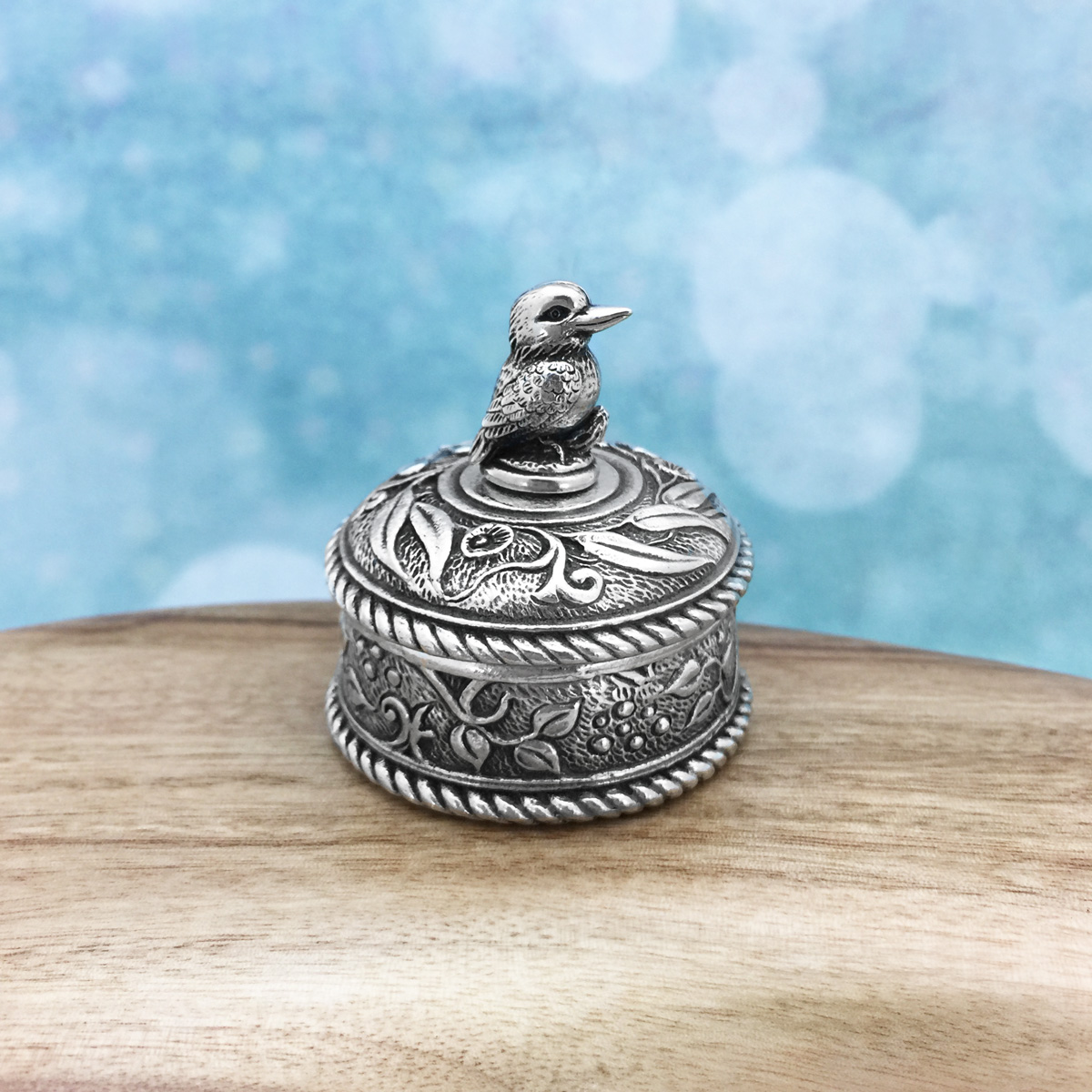 Intricately detailed miniature jewellery box featuring the native Australian kookaburra. Made in Australia out of the finest lead-and-nickel-free pewter. Width: 4cm.