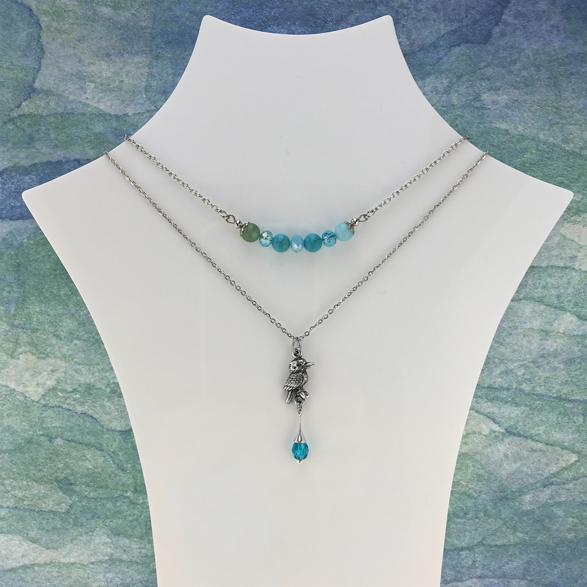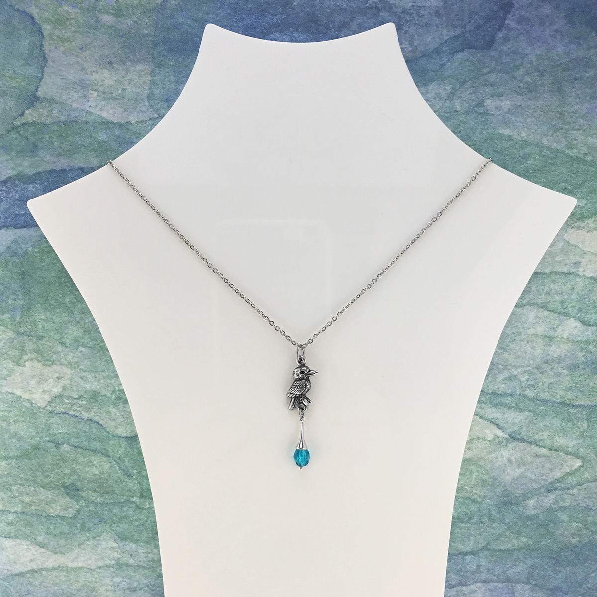 Stainless steel chain necklace featuring a superbly detailed pewter native Australian kookaburra and blue crystal. Made in Australia with the finest lead-and-nickel-free pewter. Length is 45cm and extends up to 50cm.