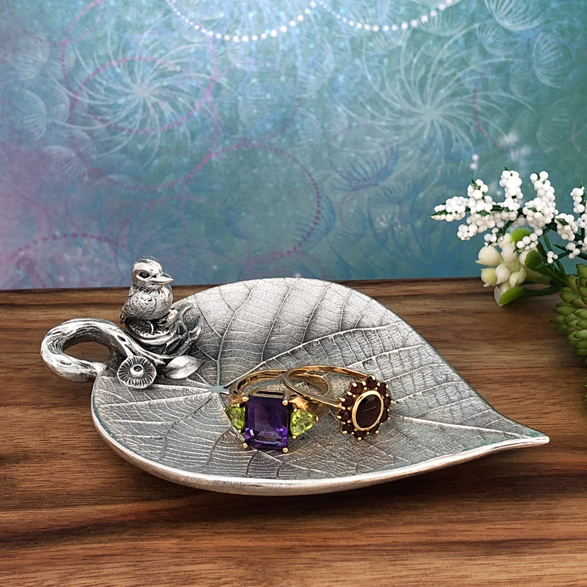 This enchanting, nature-inspired, leaf-shaped trinket dish is accompanied by a little Kookaburra sitting at the edge of this sweet and heart warming nature scene. The leaf itself is highly detailed with intricate natural patterns even underneath the leaf. It's a very versatile home decor gift perfectly suited to tea lights, wedding rings, jewellery, candy or even as a teabag holder. We trust that this beautiful piece will be a lasting treasure for years to come. Made in Australia out of the finest lead-and-nickel-free pewter. Width: 7cm, Length: 10 cm, Height: 3 cm.
