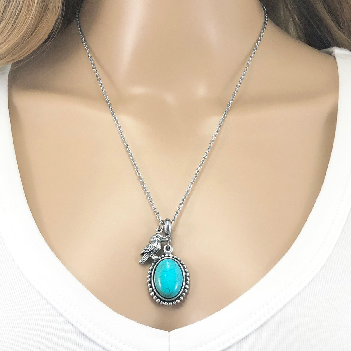 Natural turquoise magnesite gemstone necklace featuring a superbly detailed pewter Kookaburra charm. Chain length is 50cm / 20inches. Cabochon 13x18mm. Charm size 20x14mm.