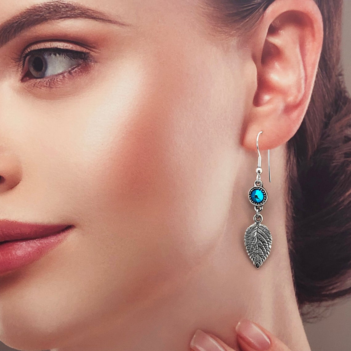 Natural leaf earrings on quality stainless steel sterling silver finished ear hooks. Beautifully detailed in bohemian style. Personalise with genuine Swarovski crystal birthstones. Choose your color from the selection for birth month or any other choice you prefer. 5 cm long and 2.2 cm wide. Leaf charm size: 1.8 cm.