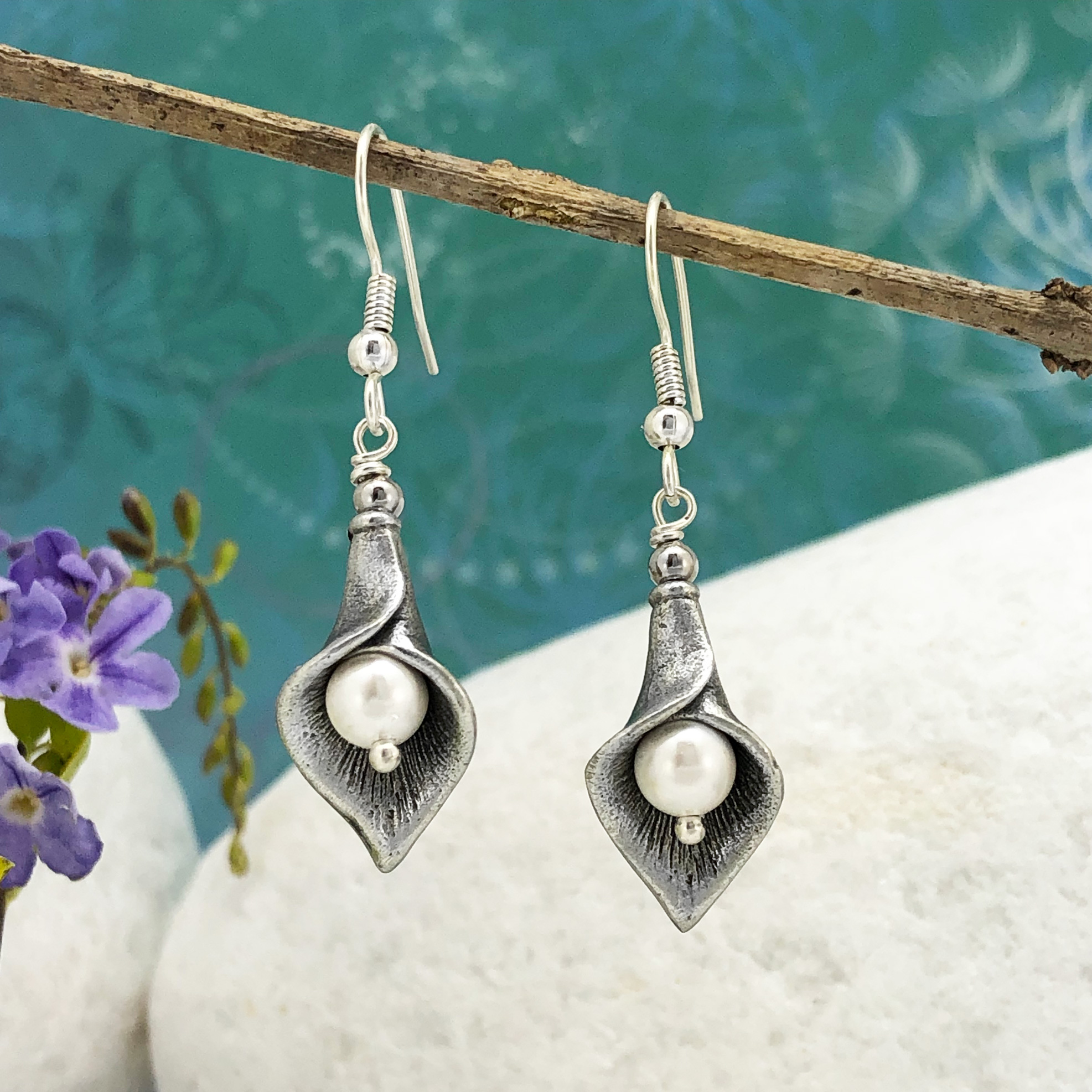 Australian made lily earrings in the Bohemian Art Nouveau style, set with white shell pearl. Length: 4.5cm.