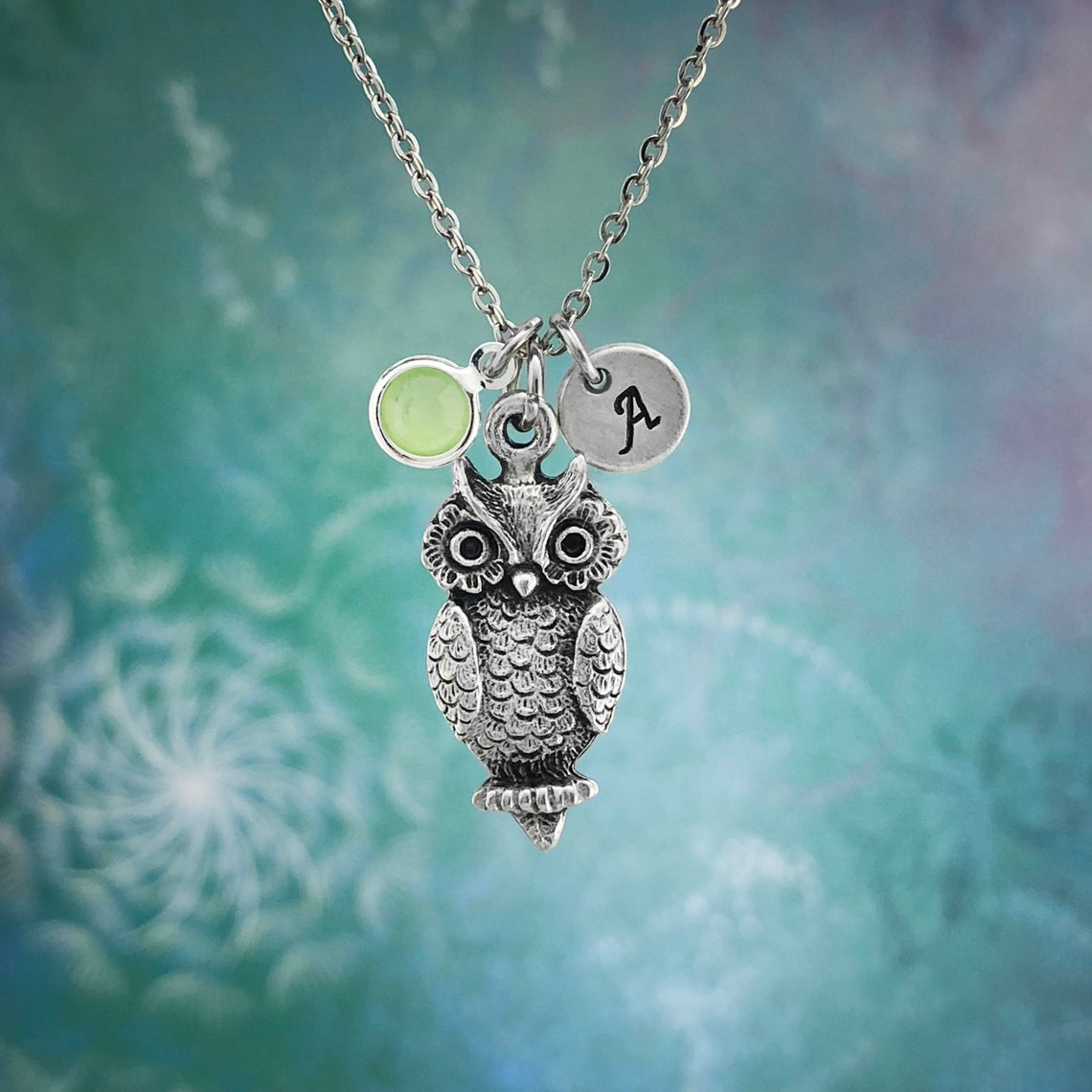 Owl Necklace With Optional Personalised Birthstone & Initial