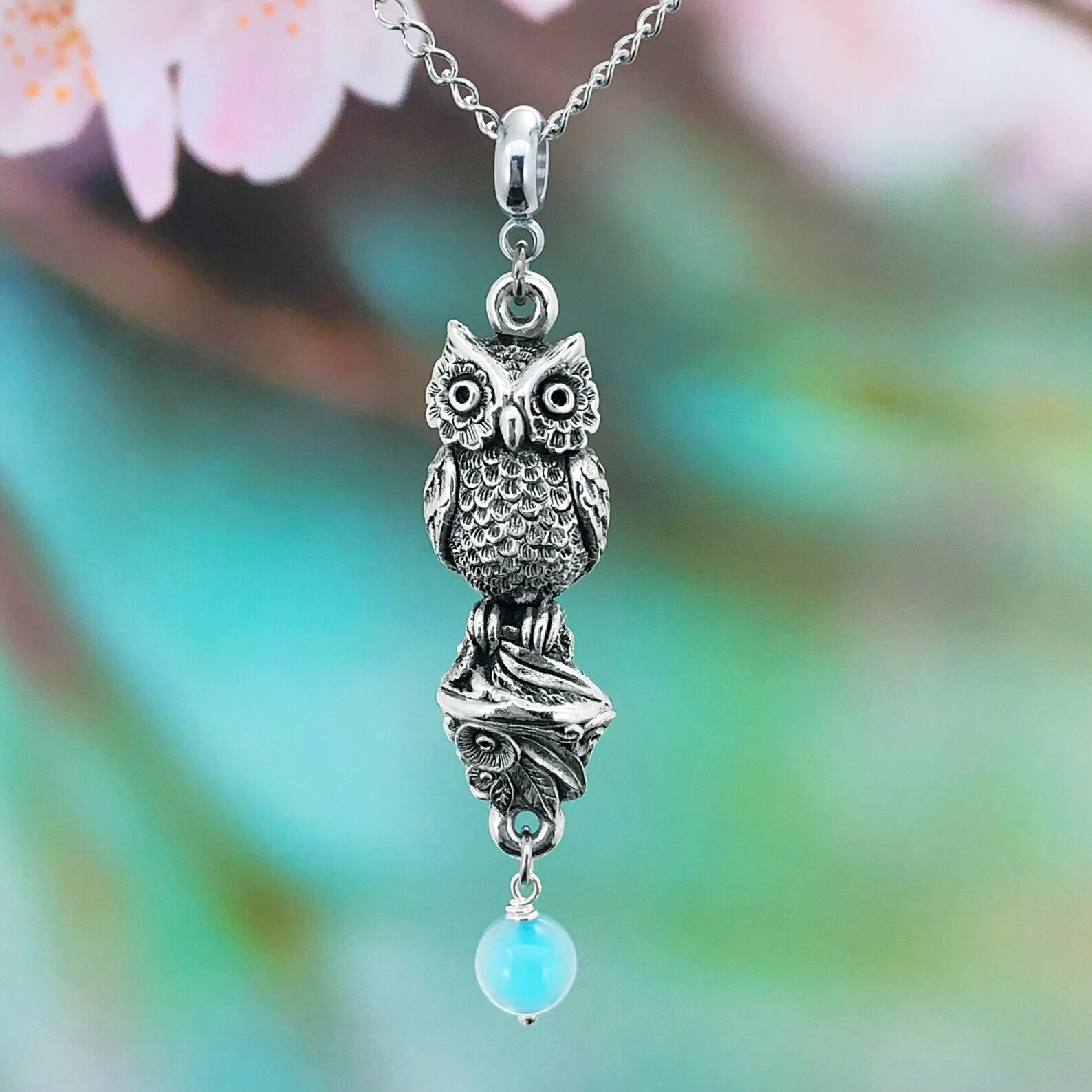 Beautifully detailed and enchanting owl necklace with sky blue agate dangle below. This little owl is hand sculpted and 3 dimensional. High quality strong stainless steel chain is included, choose your own length. This is a larger style pendant necklace best worn with longer chains. 24 inches is used on the model photo. Made in Australia with the finest lead-and-nickel-free pewter.