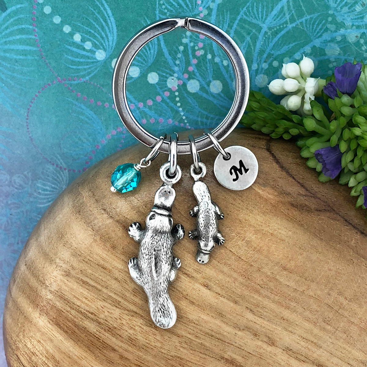 Platypus Mother & Baby Keyring with Optional Personalised Initial Charm & Optional Natural Gemstone Charm
