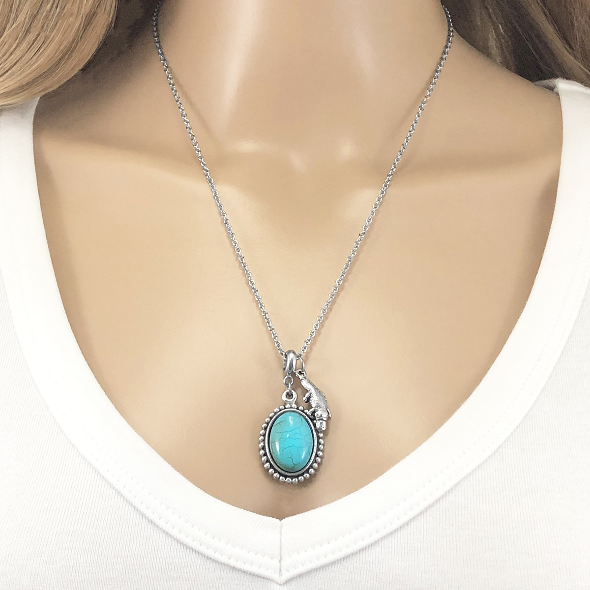 Natural Turquoise Magnesite gemstone necklace featuring a superbly detailed pewter Platypus charm. Each charm can be worn separately. High quality stainless steel chain is included. Made in Australia with the finest lead-and-nickel-free pewter. Chain length is 50cm / 20inches. Stone size 13 x 18 mm. Setting size 16 x 20 mm. Charm size 24 x 12 mm.
