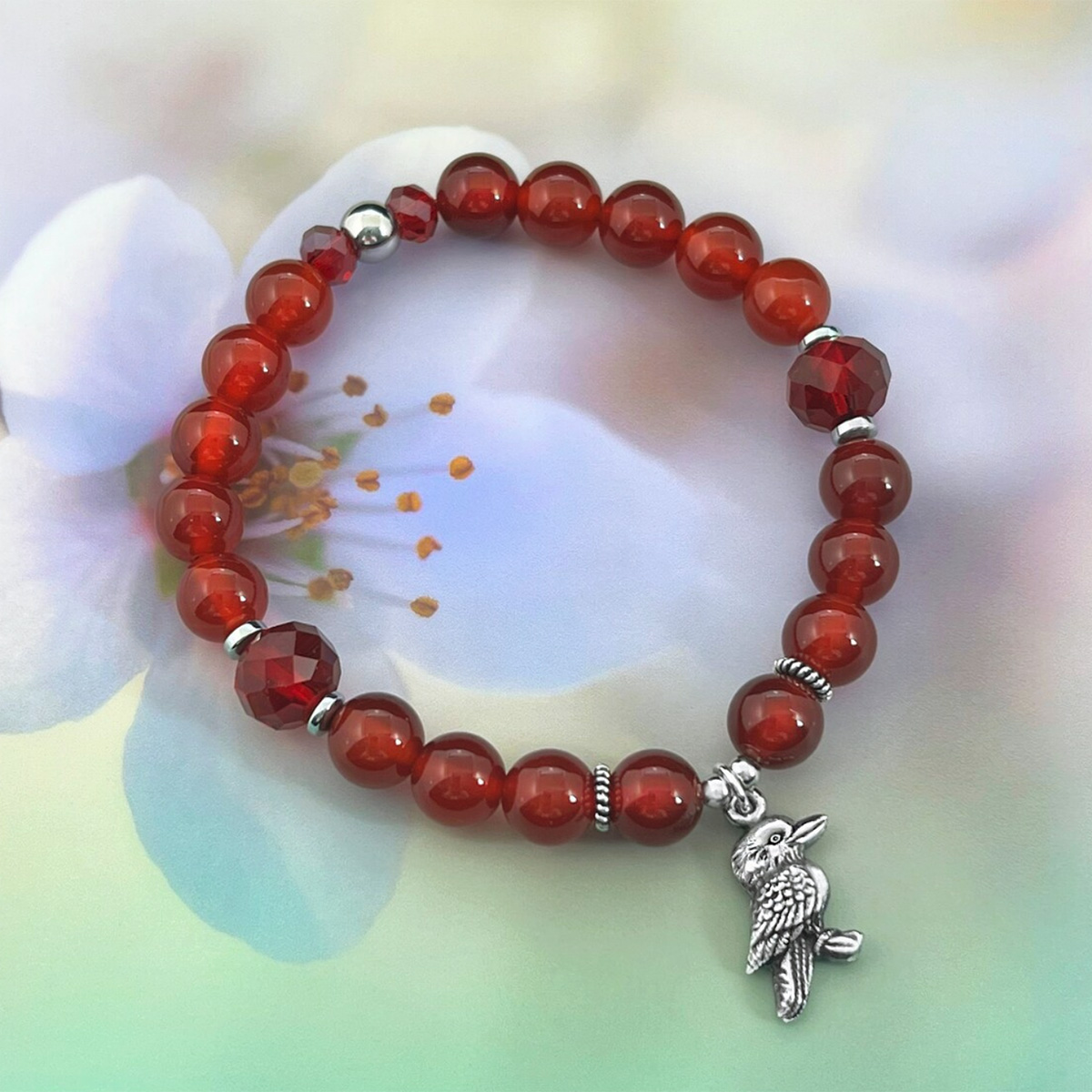 Select the charm of your choice on the genuine semi-precious rich red Carnelian gemstone bracelet. Gemstones used are: Natural Carnelian Agate, Hematite and crystals. This strikingly pretty stretch bracelet is easy to wear and perfectly suitable for layered look. All our unique charms are hand-sculpted by the artist in our studio. Charms are 100% genuine solid pewter. We use only the highest quality stretch cord. Bead size: 10 & 8mm.