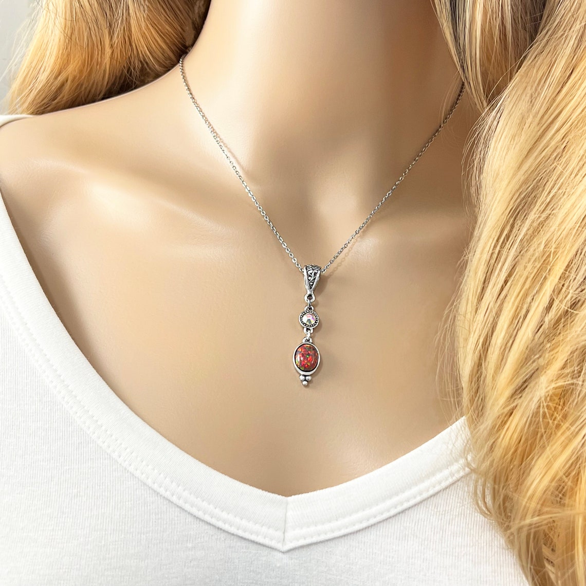 Enchanting, intricately-detailed red fire opal (created opal) necklace inspired by the beauty of the nature. Personalise with genuine Swarovski crystal birthstones. Choose your color from the selection for birth month or any other choice you prefer. Chain size is 18 inches and it comes with an extension. It will not rust or tarnish. All charms and pendants are made by the artist in the finest quality 100% genuine solid pewter. Pendant size: 6 x 1.2 cm / Opal stone size 8 x 10cm.
