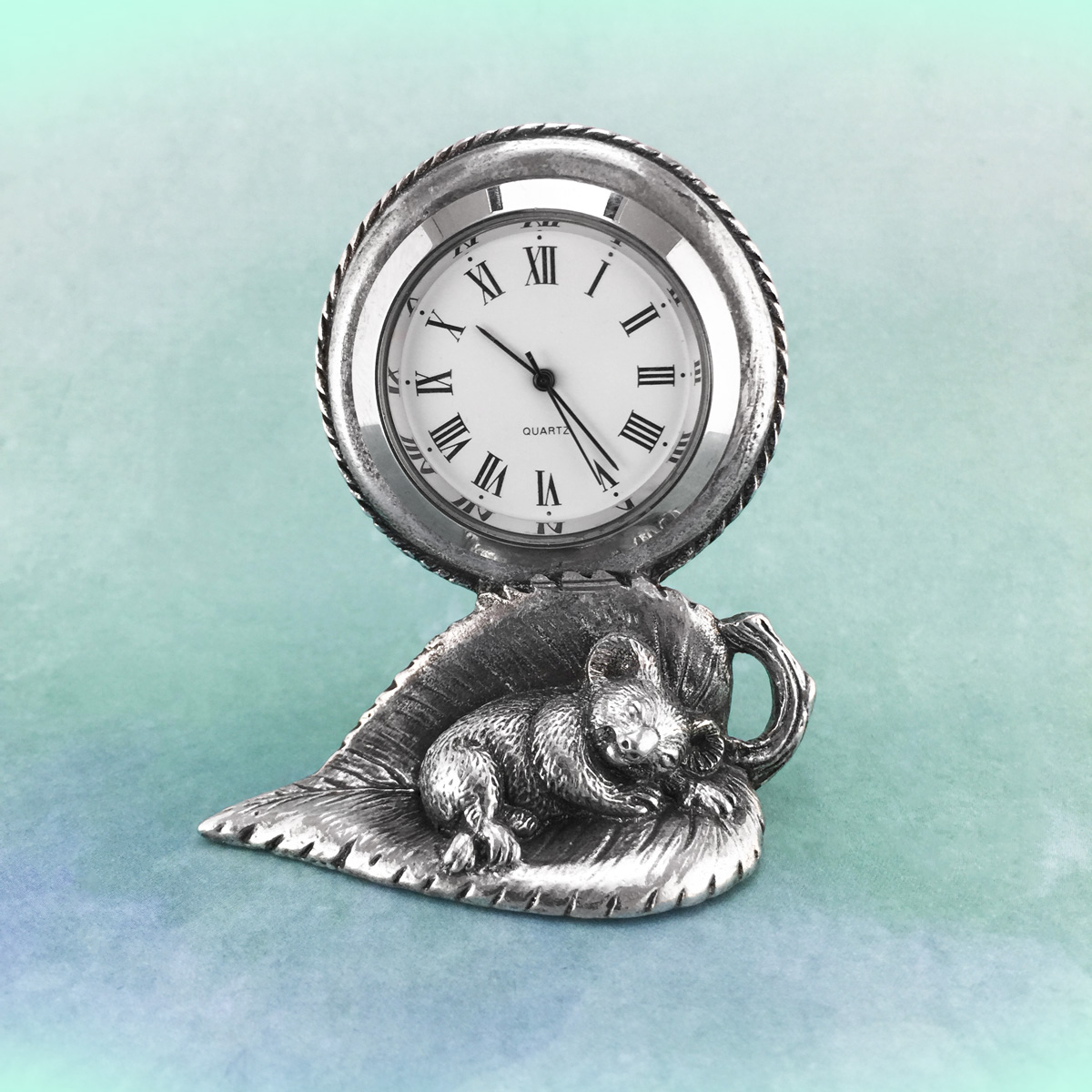 Intricately detailed clock featuring a native Australian baby koala (joey). Made in Australia out of the finest lead-and-nickel-free pewter. Width: 6cm.