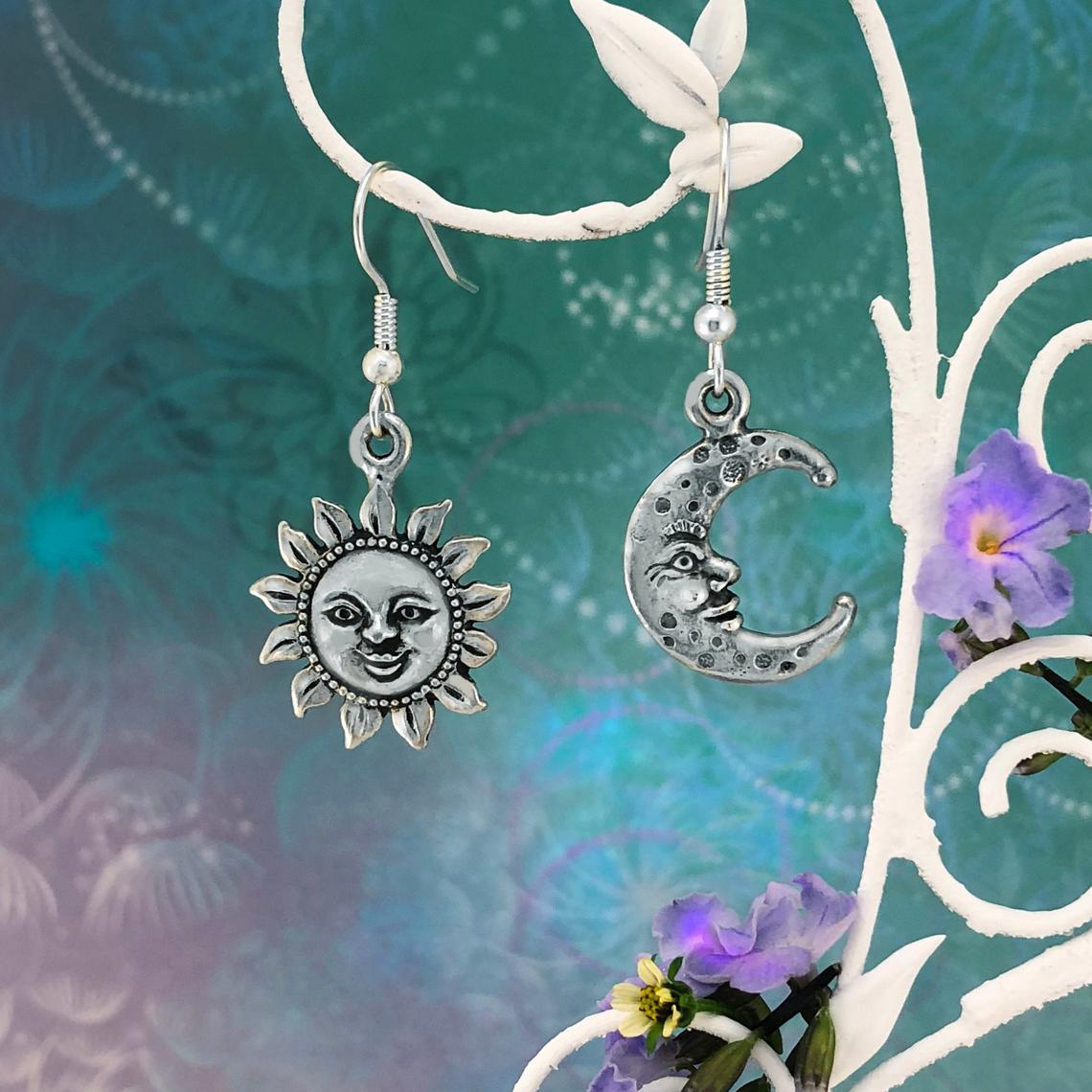 Enchanting and whimsical Sun and Moon earrings. Representing day and night. These charms are on quality stainless steel sterling silver finished ear hooks. 4.5 cm long from the top of the ear hook and 2cm wide.
