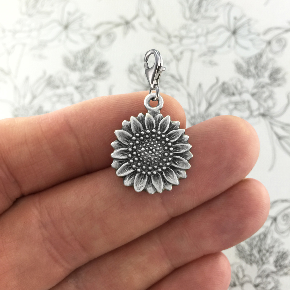 Intricately detailed sunflower charm. Made in Australia out of the finest lead-and-nickel-free pewter. 19mm x 23mm (without clasp).