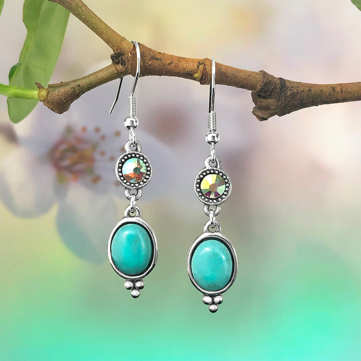 Australian made turquoise magnesite earrings in a nature-inspired Art Nouveau elegant style, matched with Swarovski AB clear crystals. Length: 5cm.