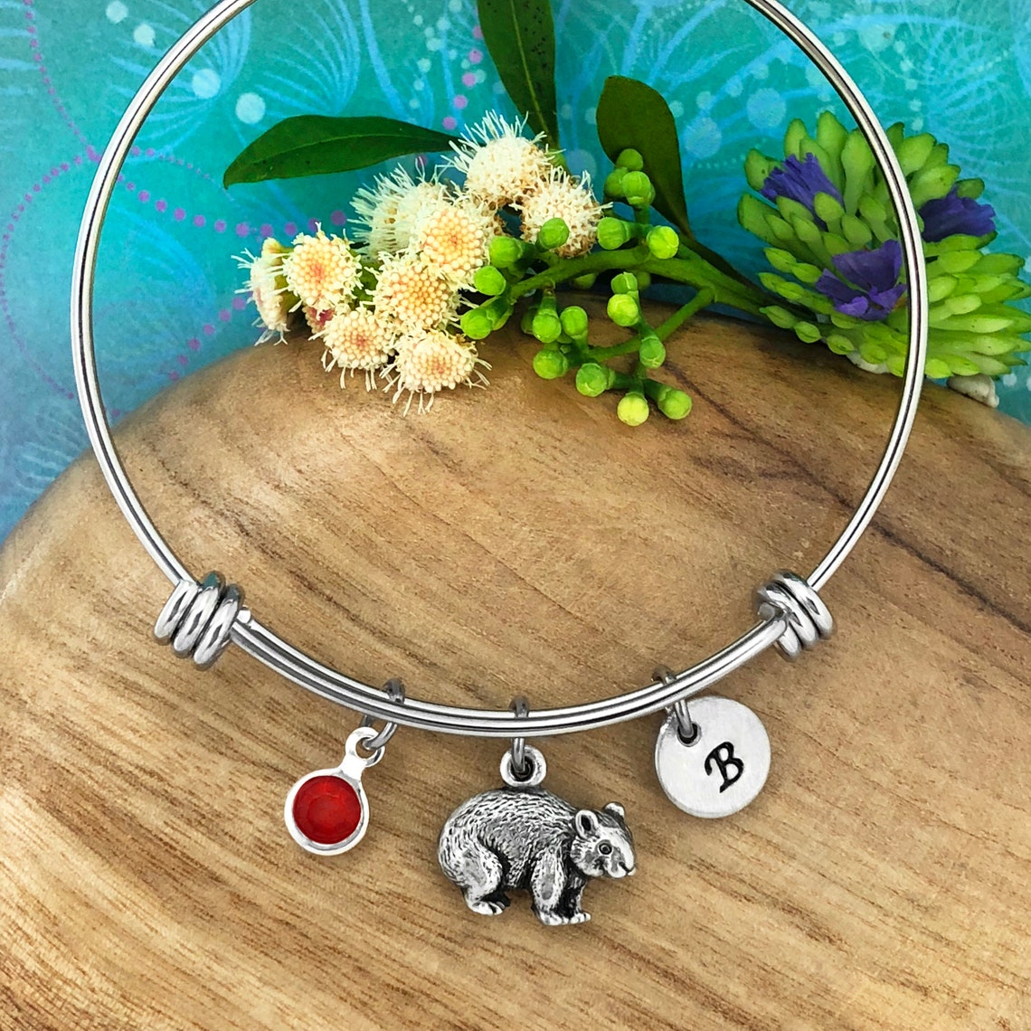Sweet little wombat on an adjustable bangle bracelet. Charm is handmade and delicately detailed. Made from solid 100% genuine pewter. Optional hand-stamped initial and birthstone. This bangle is made from high quality stainless steel, so it will not rust or tarnish. 55mm, 65mm or 75mm bangle diameter (each adjustable up to an extra 10mm). Wombat charm size: 2 x 1.4cm. Initial disc size: 8mm.